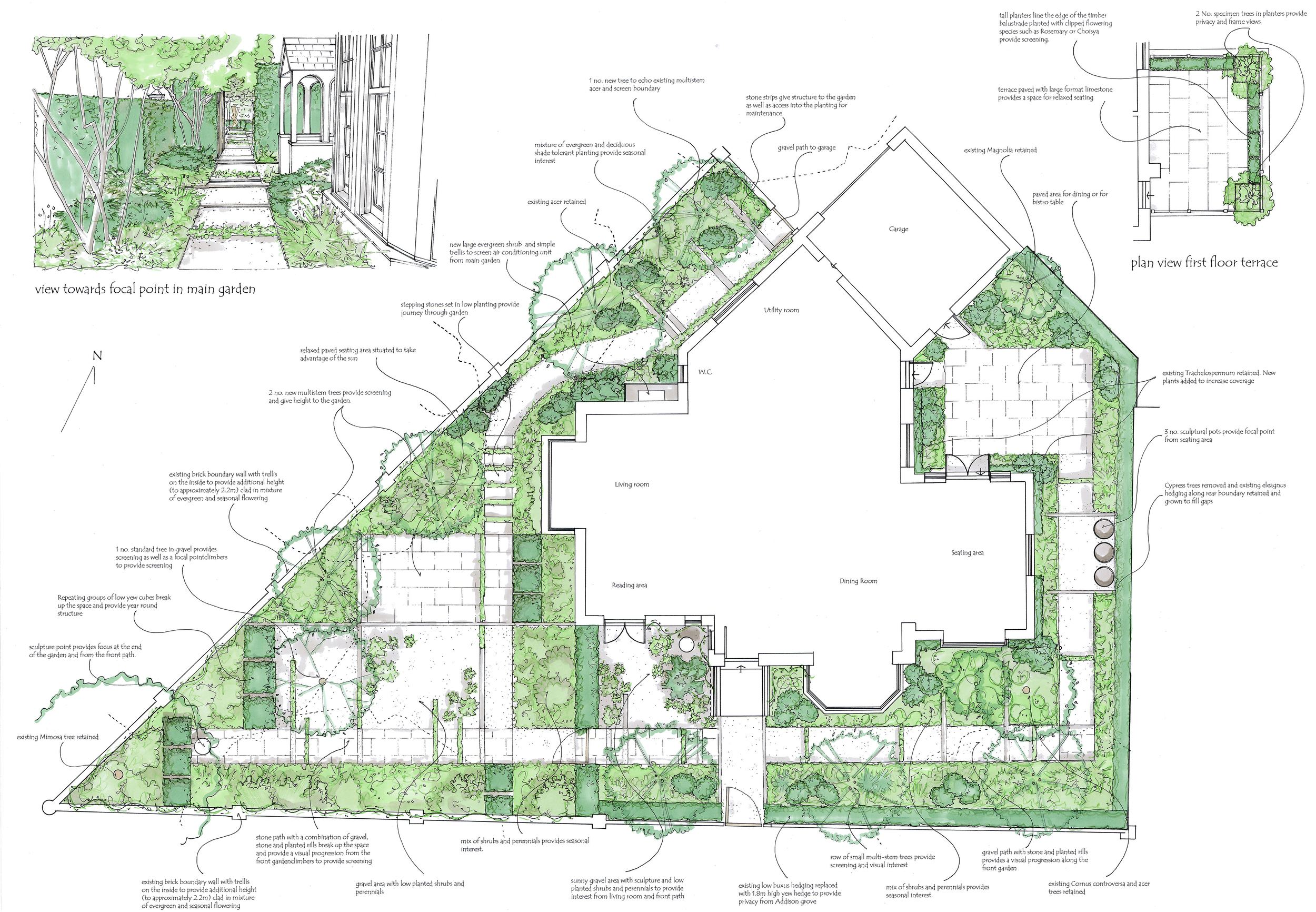 Major works were to be undertaken to the house which is in the centre of a tricky triangular site and, unusually for London, is surrounded by garden. The existing garden was made up of a number of unconnected zones: a narrow front path, a main lawn which struggled in a semi-shady triangular space, and a narrow shady path leading to a dark poky back courtyard.