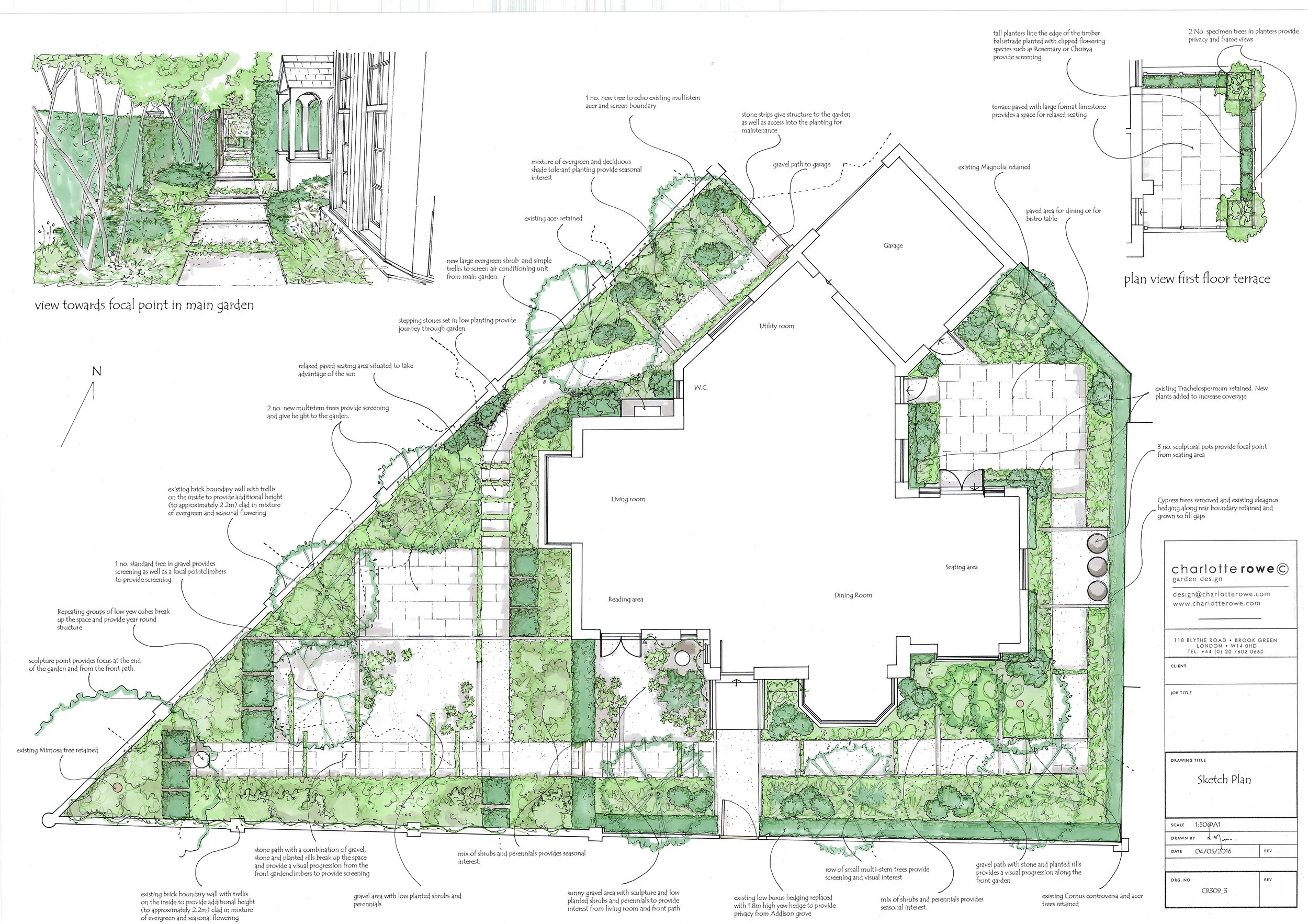 A hand drawing showing the whole garden wrapping around the house at its centre