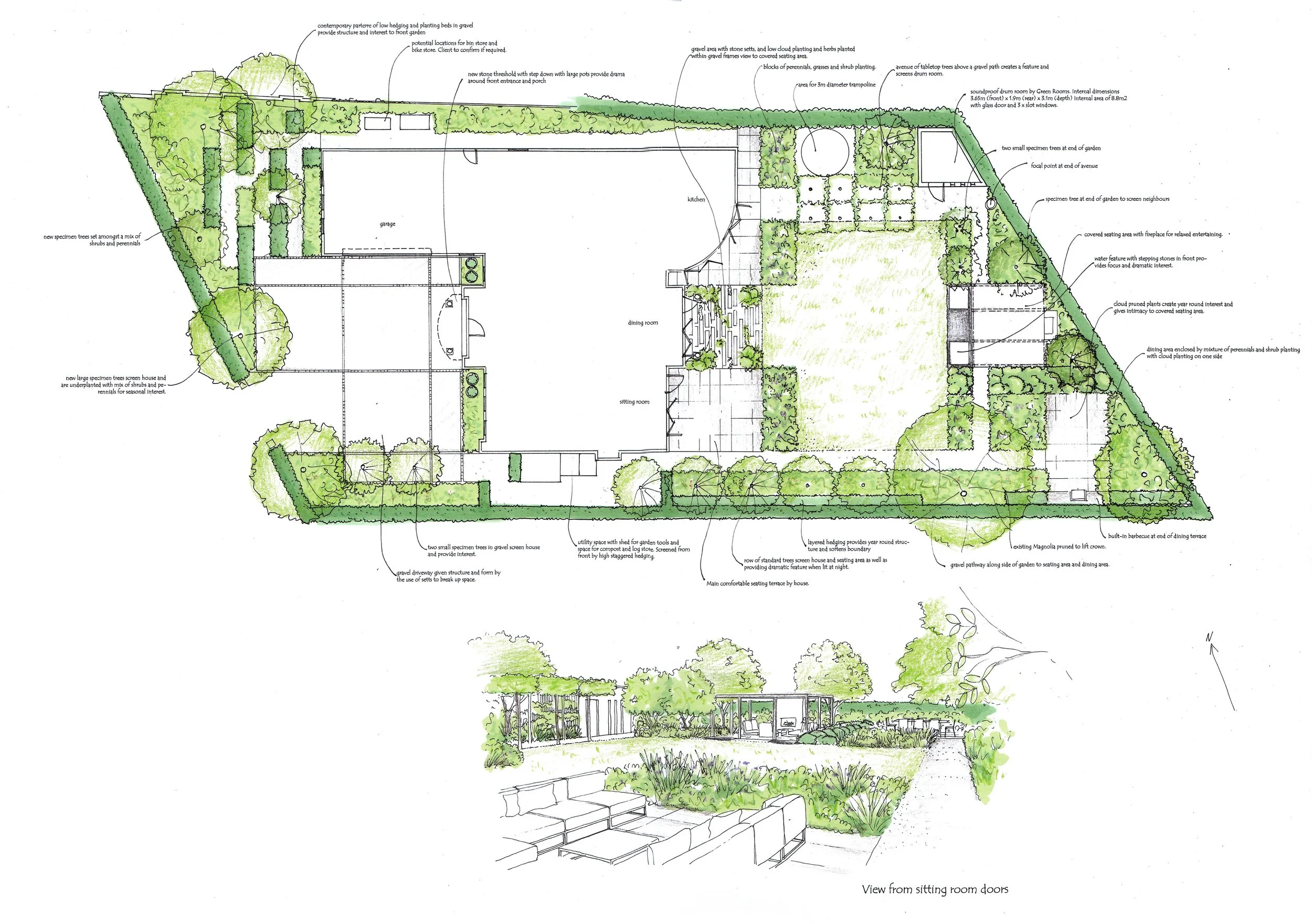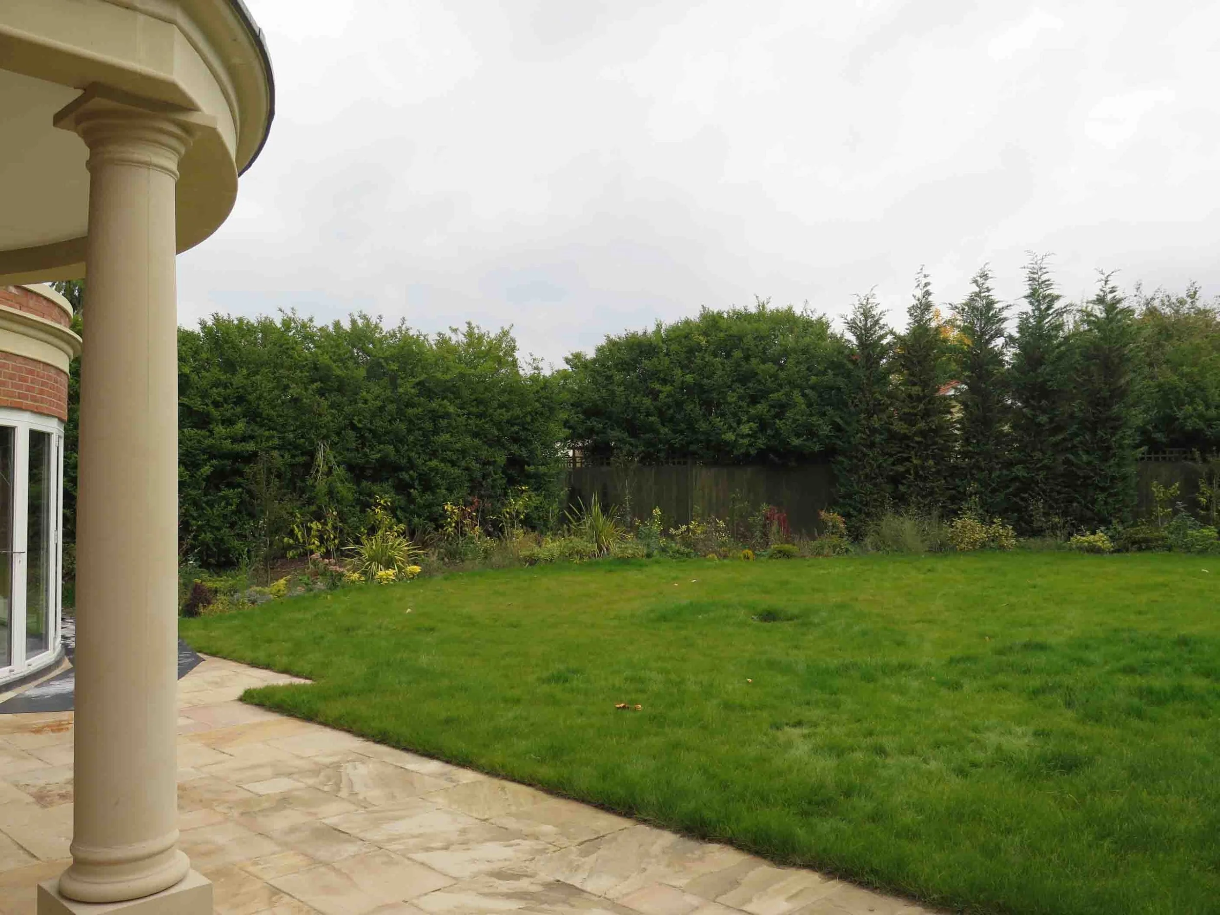 Our clients had bought a large newly built house in a gated community within a tricky shaped plot of land (one third of an acre), with a good deal of space to the front of the house and garage (400 sq metres) and a larger triangular shaped rear garden (650 sq metres) tapering to a point. The rear garden had a ‘developer’s finish’ of lawn and dull planting beds, a lovely mature Magnolia tree and a row of Cupressus leylandii at the end of the garden providing some screening from the surrounding neighbours’ properties. There was very little screening on the right hand side boundary and the front boundary of the property had newly planted and unattractive Prunus hedging.