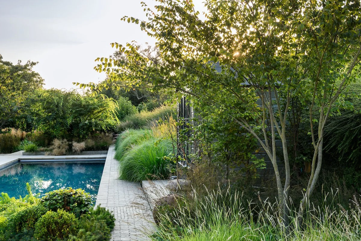 Our clients wanted a swimming pool and we designed this to be cut into the site running East West with Dutch clay pavers used along the top edge of the pool and for the wide steps into the pool. Beyond there is a kitchen garden and beyond that the landscaping has been kept informal with established fruit trees planted in long grass and wildflower meadows.