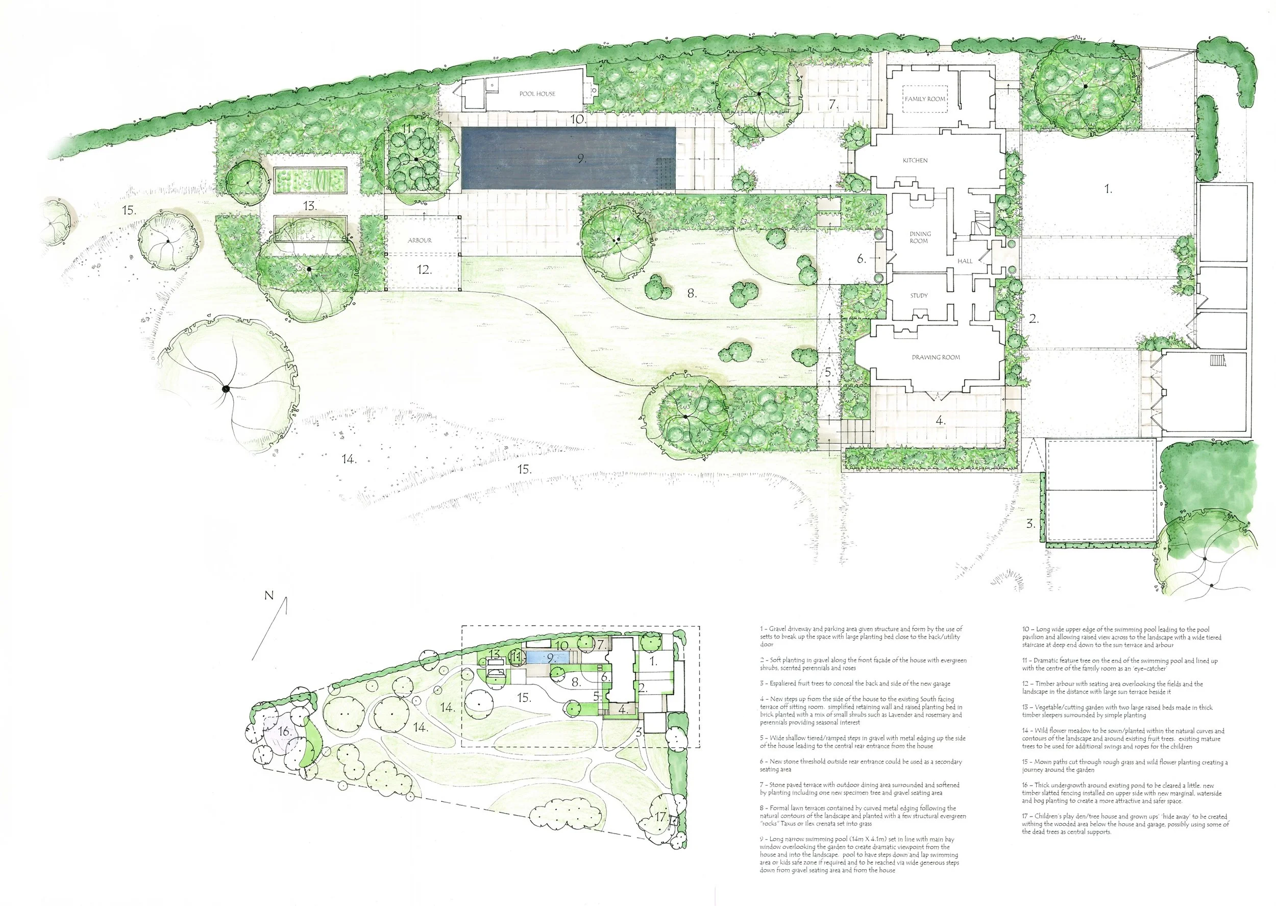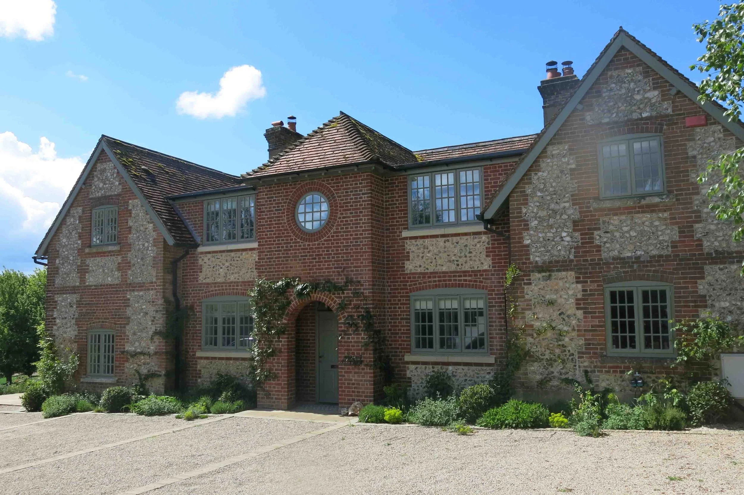 Our clients had bought an old brick and flint farm house in an area of chalk downlands in the North Western part of Hampshire. The landscape around the house is around two acres and is on a sloping site, plus an additional adjoining paddock. The house was to have some minor works carried out, in particular to the front façade but the gardens needed major work to adapt it to family life. There are open views from the house over the fields to the South and the gardens stretch mainly to the West to a natural pond and wildlife sanctuary at the end of the site.