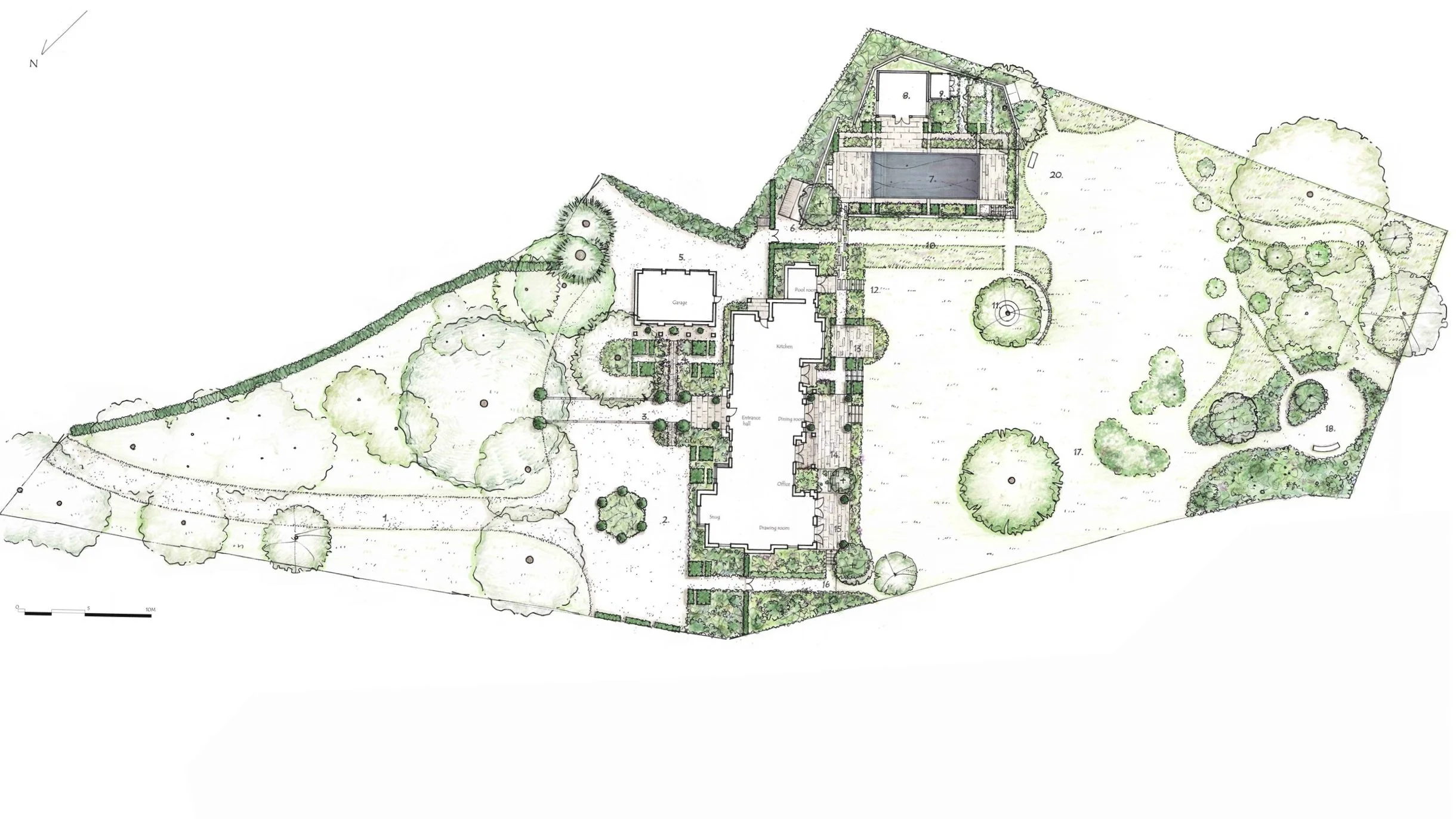 Some years ago we designed a lovely courtyard garden in Chelsea for clients who also had a weekend house in rural Surrey. Recently our client wanting to spend more time in the country, decided to replace the small Surrey house with a new, larger architect designed house. The 1.75 acre site, with astounding views over a deep valley, had a walled garden, built in the 1960s, enclosing a swimming pool which needed to be replaced and mature gardens which needed review. Charlotte Rowe and Design Director Tomoko Kawauchi’s brief was to redesign the whole site and review the walled garden and pool.