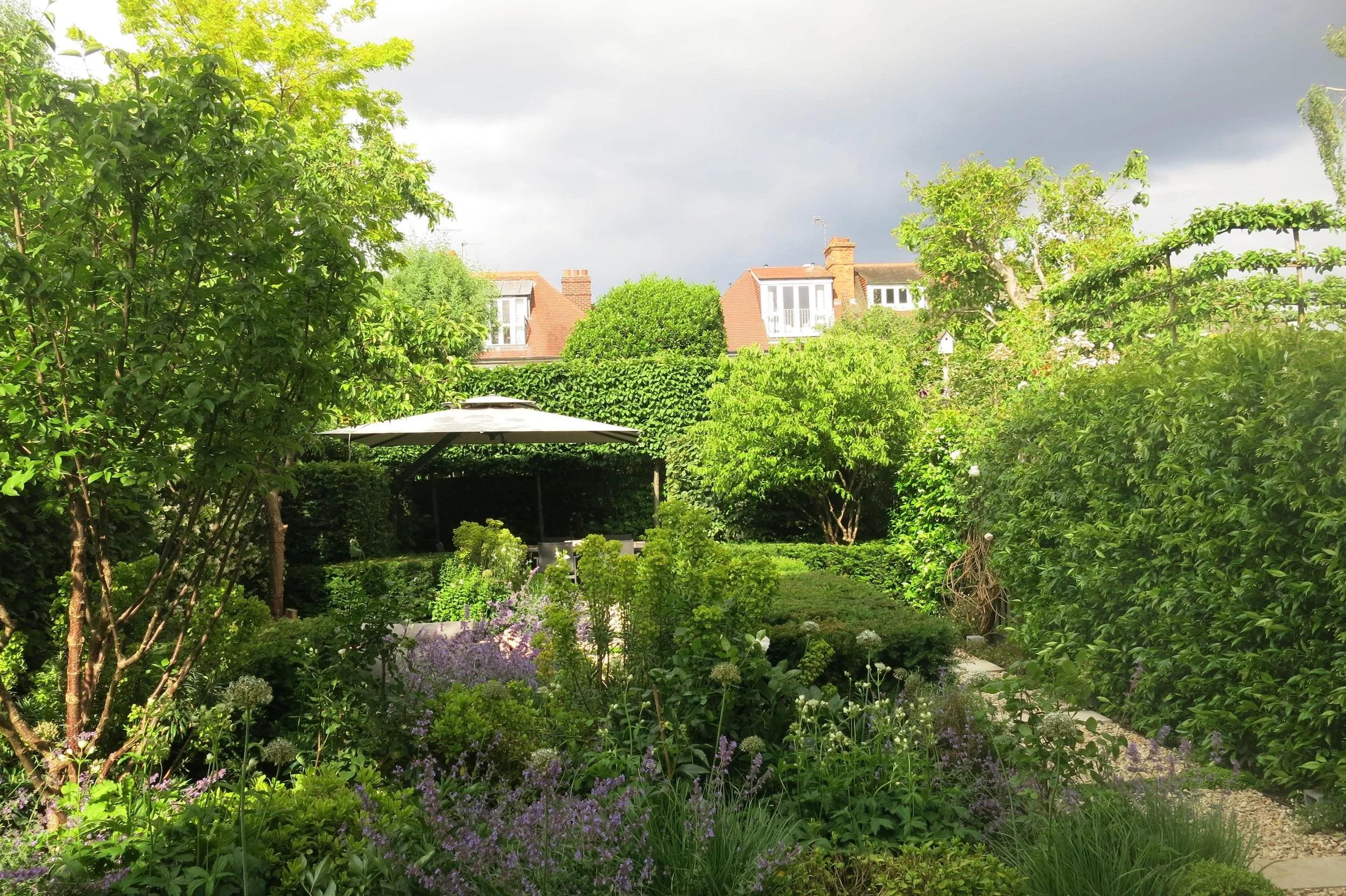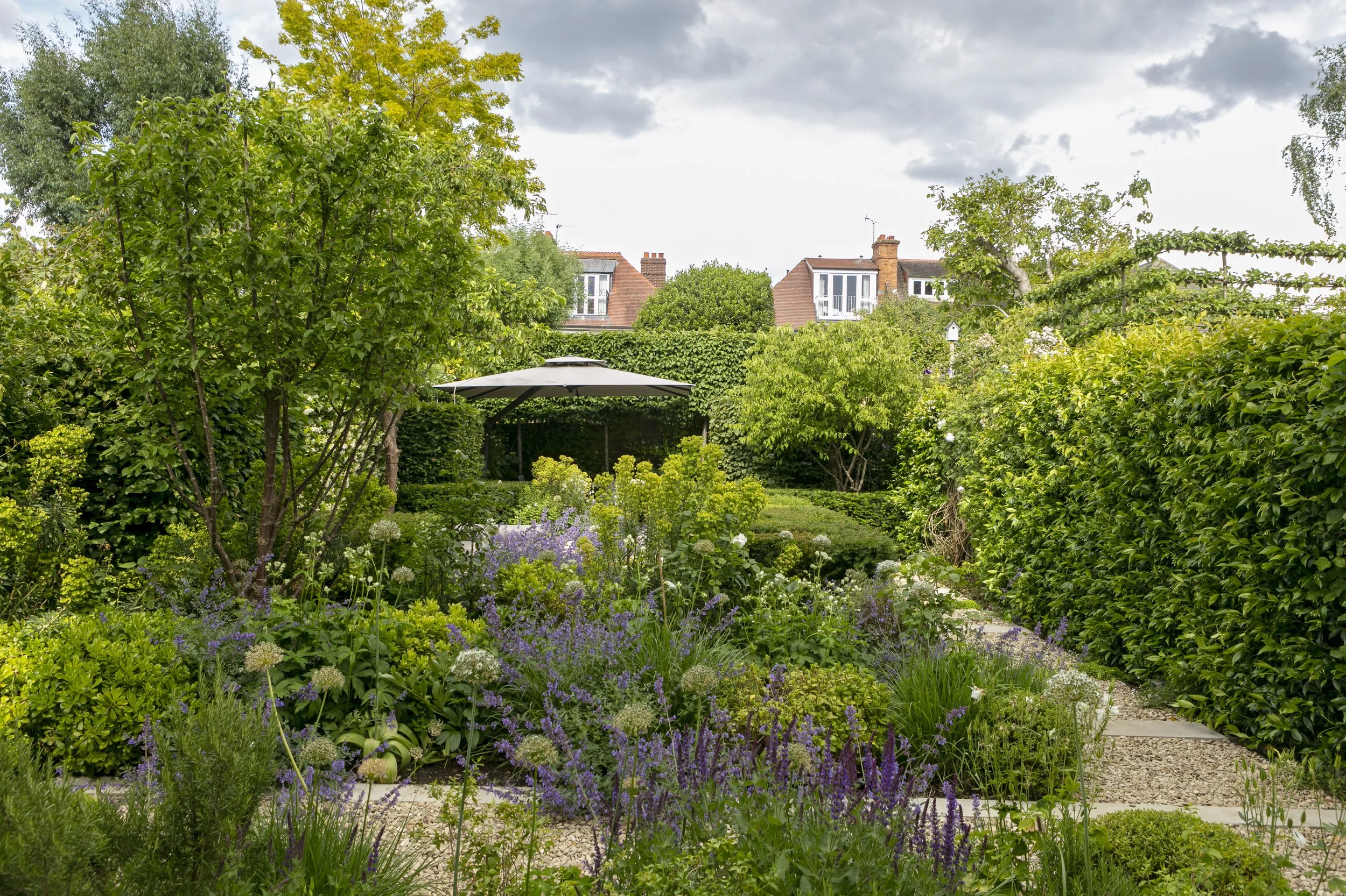 A fire bowl and comfortable outdoor sofas in the gravel seating area and heaters on the dining terrace allow the family to use their garden late into the summer evenings. Lighting on the multi-stemmed and pleached trees creates views into the garden throughout the year.
