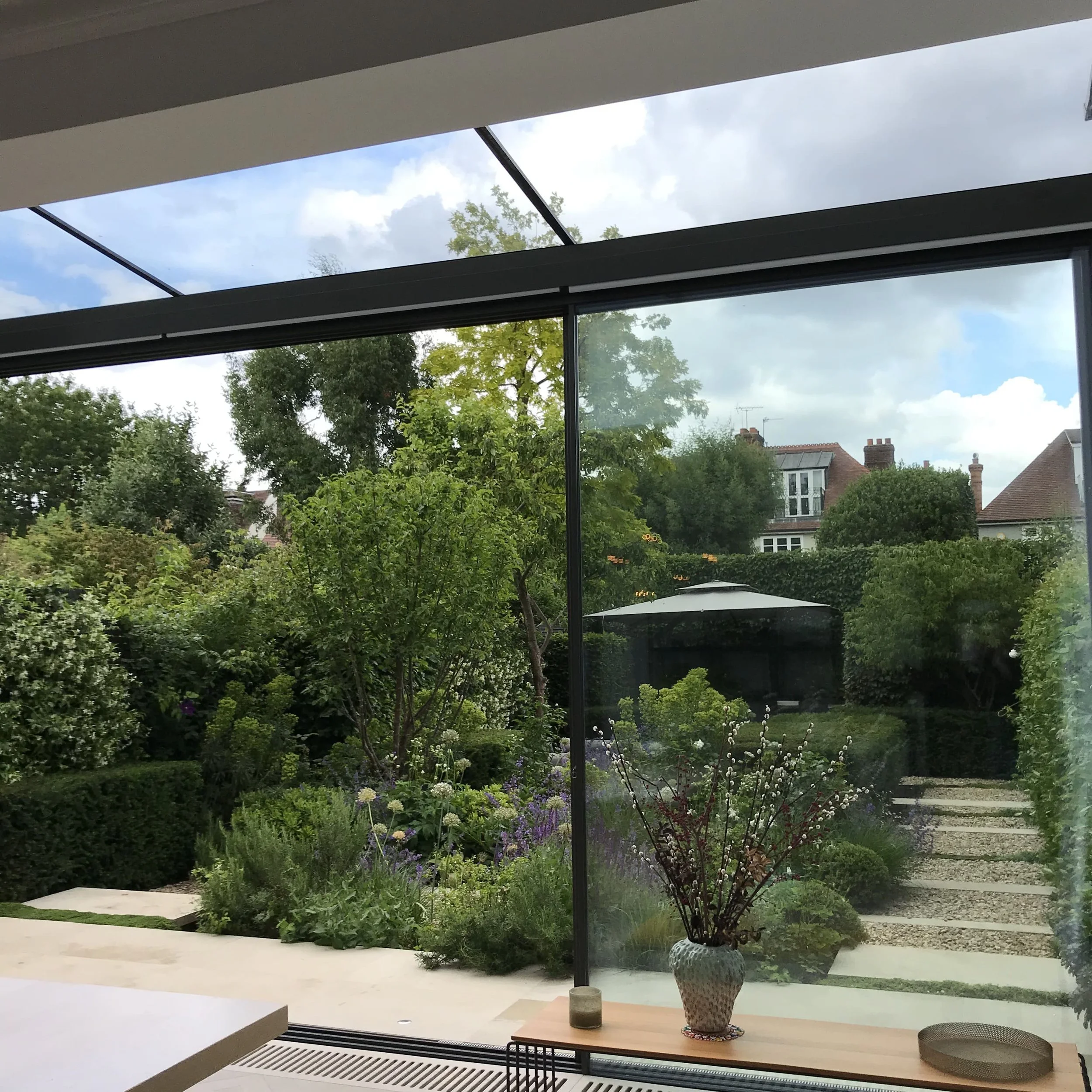 Our clients commissioned us to redesign their compact North East facing rear garden to complement a major refurbishment of their late Victorian home in a more contemporary style. The new house layout extended the dining room into the garden, with floor to ceiling sliding glass doors spanning the rear of the house. This created an important view from the front door right through the house to the end of the garden where we positioned a multi-stem Cornus mas tree to draw the eye.