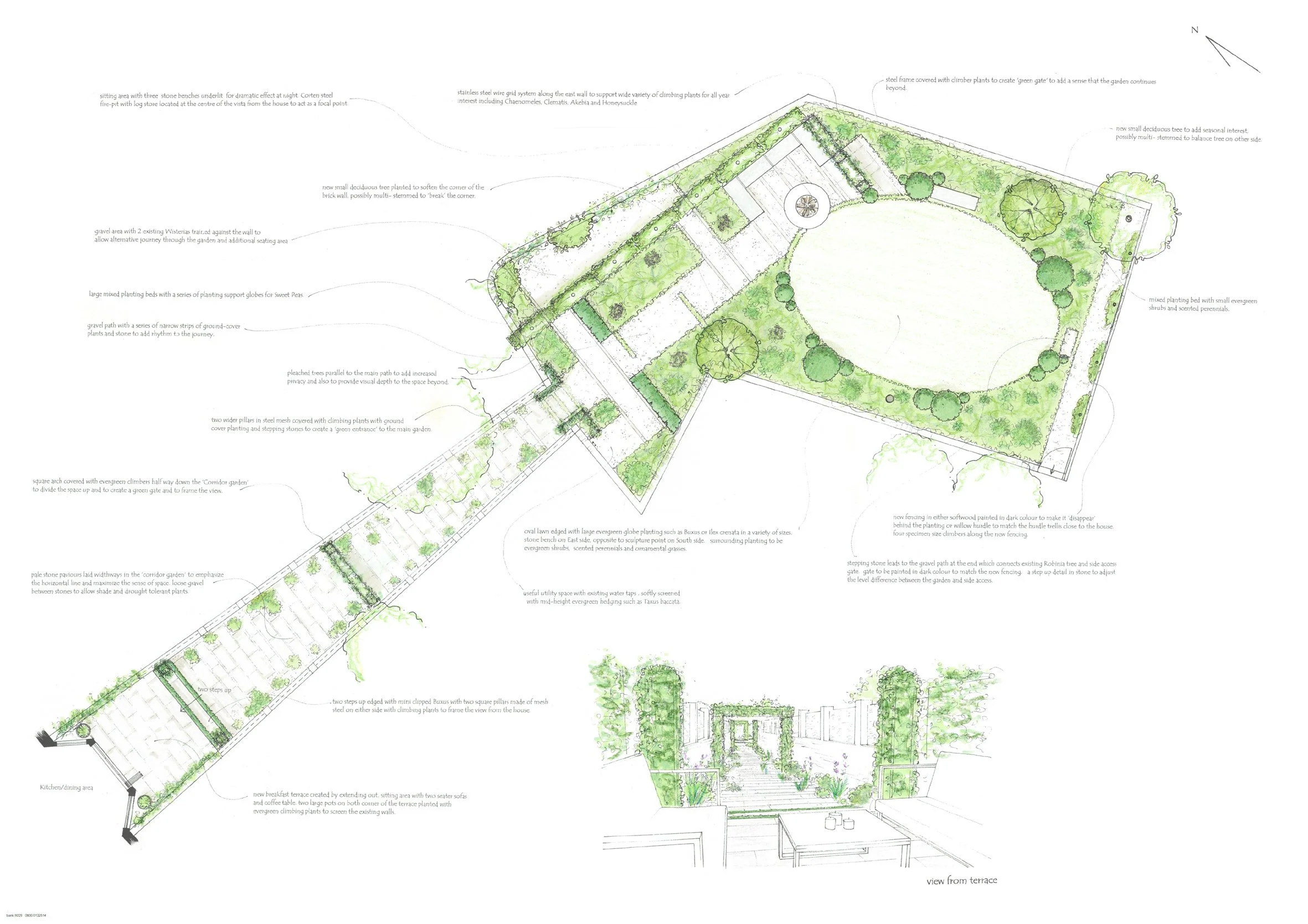 Our new design softened the passageway using limestone paving interspersed with gravel, planted rills and arches with climbers and roses to break up the vista. Beyond, in the main garden, the path leads to a circular firepit and L-shaped limestone bench clad with an avenue of pleached hornbeams immediately behind lead the eye down to the firepit. From here is the centrepiece of the garden an oval lawn, punctuated with large Buxus globes and surrounded by a range of shrubs including Hydrangea and Sarcaccoca, and two small specimen trees. Perennials including Gaura and Alchemilla flow through grasses including Stipa and Molinia.
