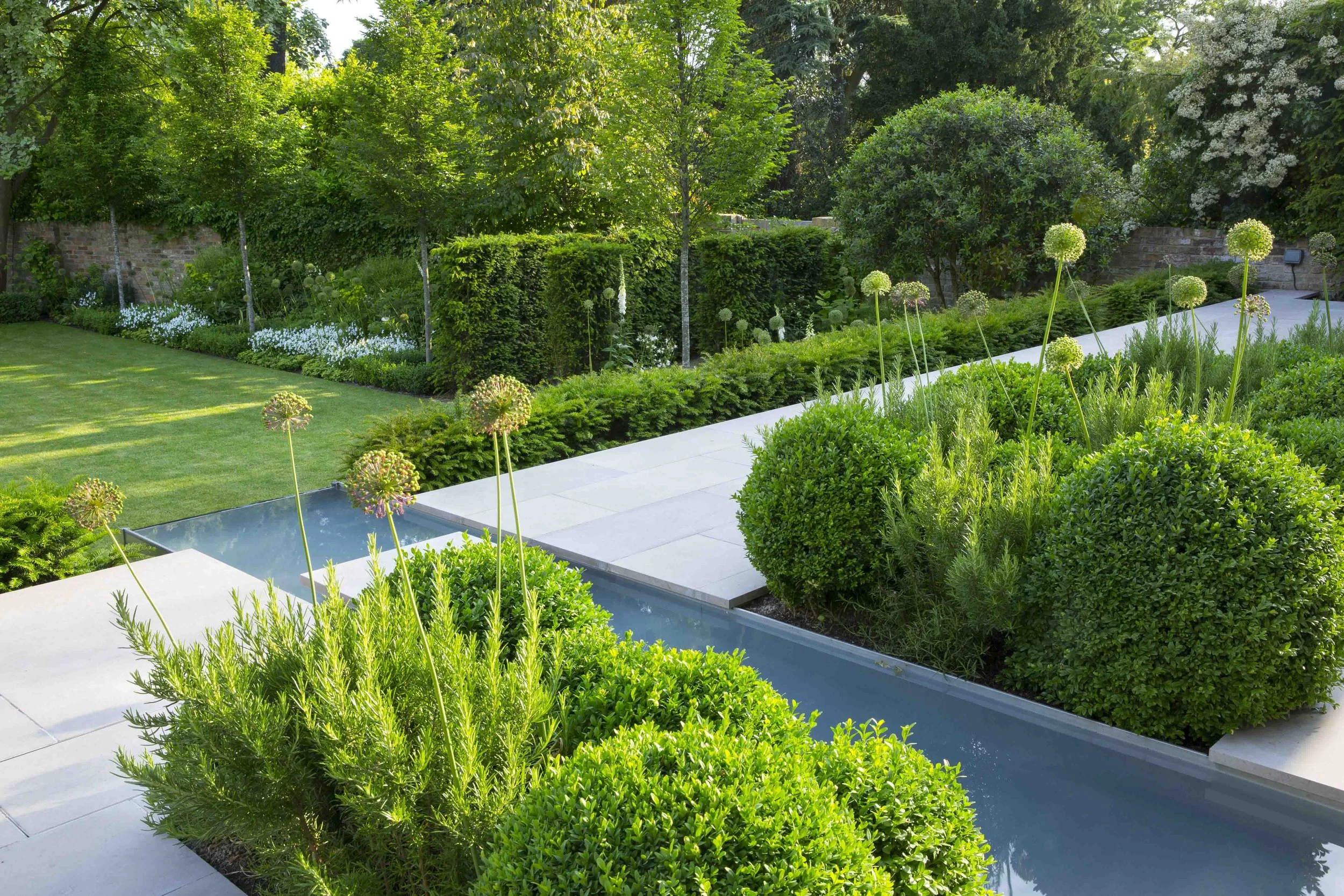 Charlotte Rowe Garden Design created a main terraced paved in English limestone with a long water feature cutting through, surrounded with 'cloud' planting of clipped Buxus sempervirens. This water feature is mirrored by a ground level polished granite plinth and monolith which acts as a focal point at the end of the garden.