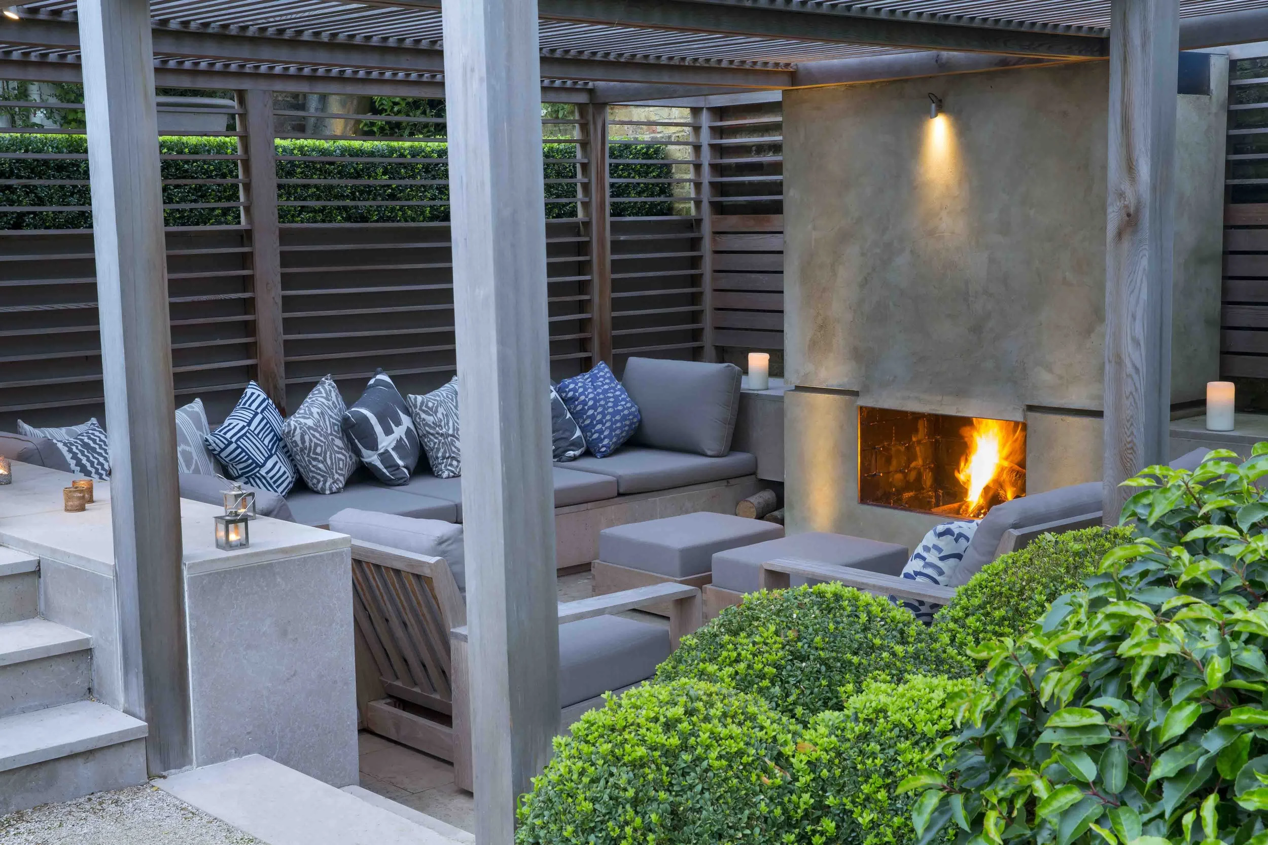 At the bottom of the stairs is the partially enclosed, private fireplace terrace within a timber arbour with a log fire as its main feature. We designed a wide built-in day bed for which we commissioned a mattress and cushions in outdoor fabric to match the cushions of the teak armchairs.