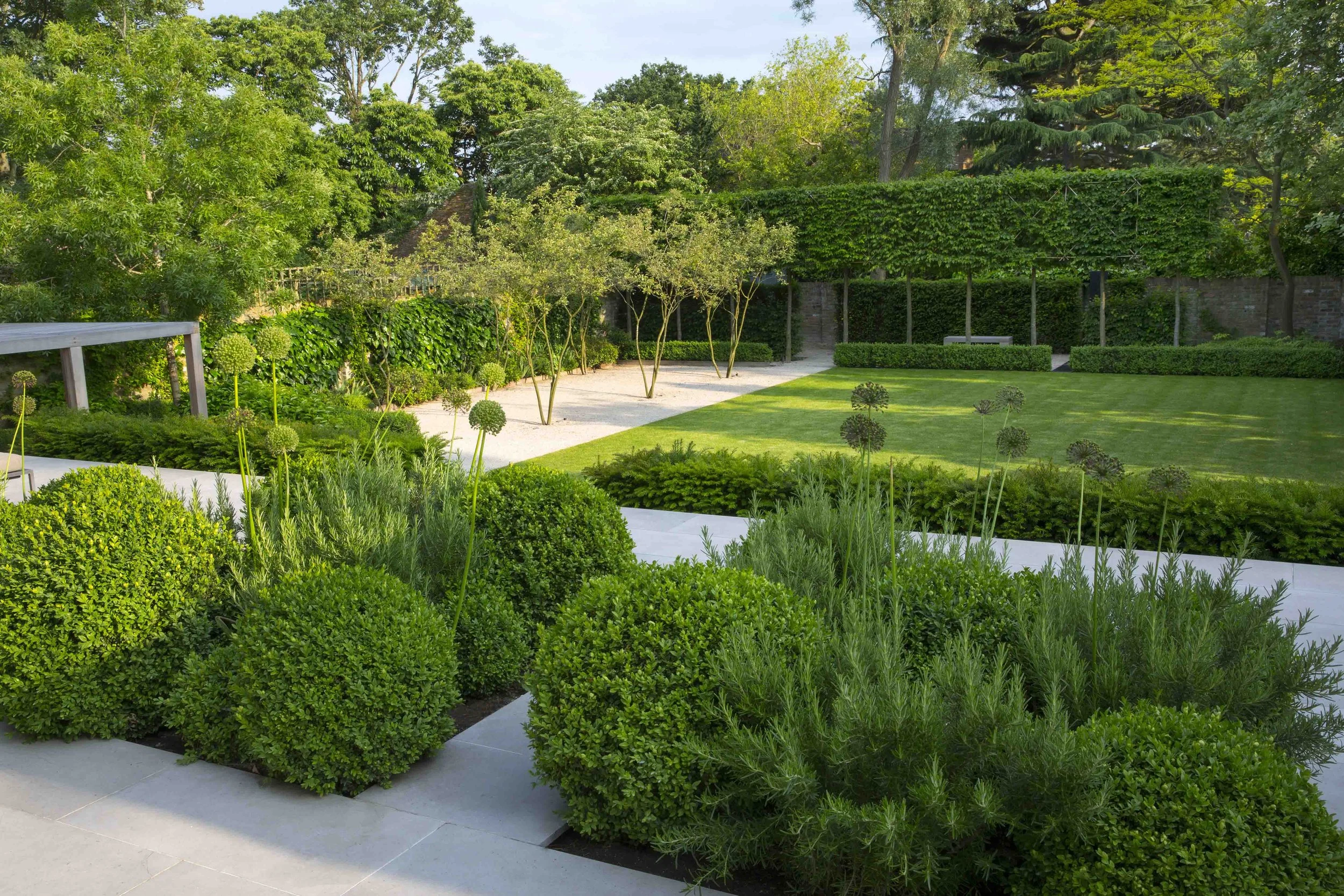 The planting uses a limited palette of colour with greens, limes and creams featuring clipped Buxus, Pittosporum, Ilex crenata, Hebe angustifolia parviflora and Myrtus communis Tarentina interplanted with perennials and ground covers. A number of trees were removed and these have been replaced with mature specimens including Parrotia persica and Fraxinus angustifolia ‘Raywood’ as well as a wonderful mature Osmanthus heterophyllus and an avenue of fastigiate Carpinus betulus.